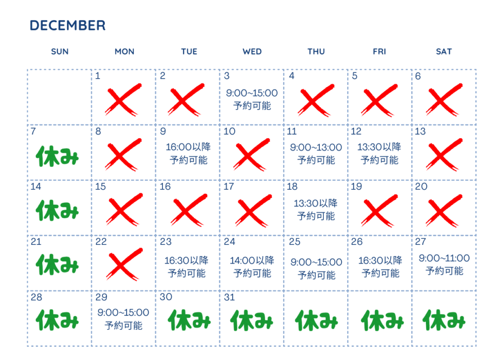 カレンダーが✕の日でも近隣の方でしたら朝イチまたは夕方の訪問も可能な日もありますので、